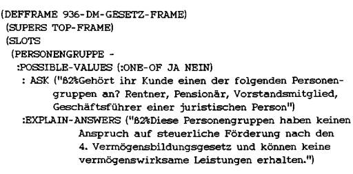 Eine weitere Methode, Erklärungen zu erstellen, besteht darin, alle möglichen Fragen der Benutzer im voraus zu antizipieren und die entsprechenden Antworten als Text zu speichern.144 Wenn eine Frage gestellt wird, präsentiert die Erklärungskomponente die im voraus vom Knowledge Engineer oder dem Experten erstellte Antwort. Diese statischen Beschreibungen werden z.B. mit den Regeln oder Frames der Wissensbasis verbunden.145