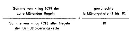Ein anderen Ansatz wird bei TEIRESIAS verfolgt. Dort werden die Sicherheitsfaktoren der Regeln als Maß für den Informationsgehalt verwendet.321 Es wird angenommen, daß eine Regel mit einem hohen Sicherheitsfaktor [certainty factor oder CF] 322 weniger Informationen enthält als eine Regel mit einem niedrigen, da derartige Regeln eher als Definitionen betrachtet werden können.323 DAVIS benutzt den Ausdruck -log (certainty factor) als ein Maß für den Informationsgehalt einer Regel.324 Wie aus Abb. 17 ersichtlich ist, erklärt das System so viele Regeln, bis die Summe von deren Sicherheitsfaktoren eine Größe erreicht, die beide Seiten der Formel ausgleicht.