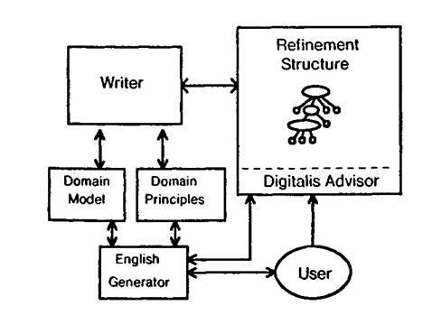 XPLAIN besteht aus fünf Teilen: dem automatischen Programmierer [Writer], dem problembeschreibenden Wissen [Domain Model], dem Problemlösungswissen [Domain Principles], einem Sprachgenerator [English Generator] und einem Trace der Programmerstellung [Refinement Structure].369