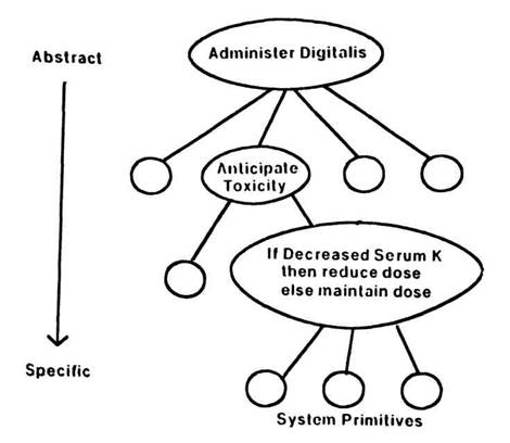 Die Vereinigung der beiden Wissensarten erfolgt, indem der automatische Programmierer seine Arbeit mit einem abstrakten Ziel, wie z.B. 'verschreibe Digitalis', beginnt. Dieses Ziel wird bei der Erstellung des Programms so lange in Unterziele unterteilt bis eventuell die unterste Ebene der Aufteilbarkeit erreicht ist [system primitives].379 An diesem Punkt stoppt das Programm und das Ergebnis repräsentiert ein lauffähiges Computerprogramm.380